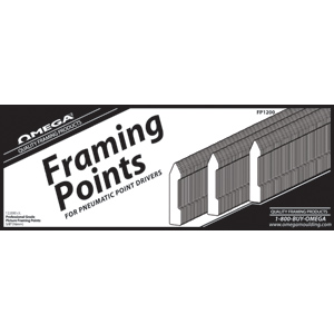 Long sleeve Omega Framing Points are designed to fit FrameMaster & compatible pneumatic hard point drivers. Box contains 12,000 5/8” long points per box.